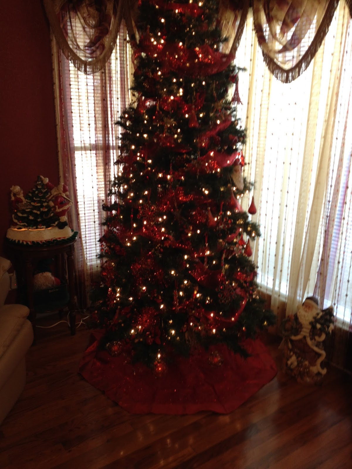 It's a new tree this year....I was very sad to part with the tree I got the first Christmas after moving here to Galena. It was the prettiest tree I've ever had. It was wonderful the first 3 years, but the last 3 years, I've had to string lights as the original lights no longer worked. And it was so much effort to string lights (that seem to only work for one year), that I finally gave it away and got me a new tree. It's still an all "red" decorated tree with the beautiful decorations that Judy Hall gave me that first year. I love those decorations!